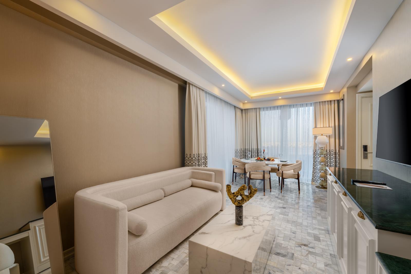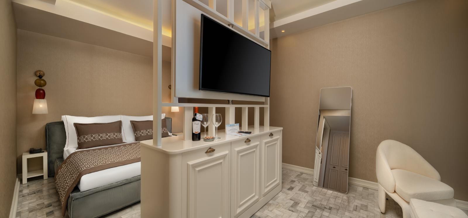 5 yıldızlı konaklama ayrıcalıklarını sunan otelimiz; bahçe, ortak salon ve teras gibi sosyal alanlarıyla da misafirlerine huzurlu bir ortam sağlar. 20 m² genişliğe sahip Zemin Suit Odamızda TV, minibar, çay/kahve makinesi, klima ve ücretsiz Wi-Fi gibi konfor sağlayan tüm imkanlar mevcuttur. Ayrıca saç kurutma makinesi ve telefon da odanızda yer almaktadır. Modern tasarımı, ferah yapısı ve zemin katın sunduğu kolay erişim avantajıyla Zemin Suit Odamız, konaklamanızı daha keyifli ve ayrıcalıklı bir deneyime dönüştürecek.