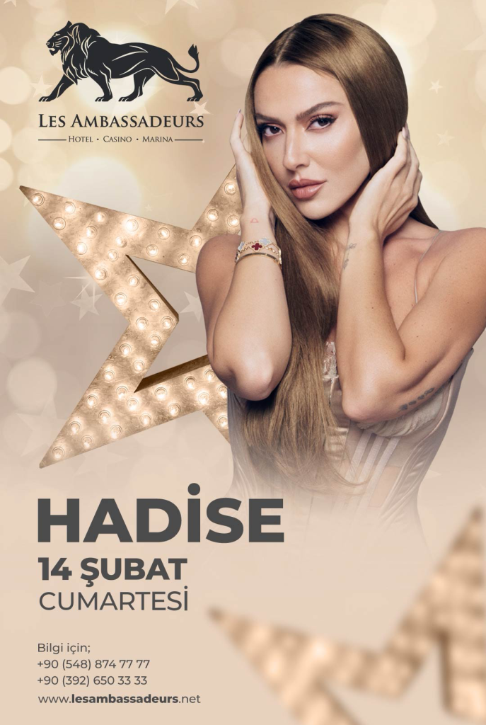 Türk pop müziğinin yıldız ismi Hadise, 14 Şubat Sevgililer Günü’nde Kıbrıs konser takviminin en özel gecelerinden birinde sahne alıyor. Les Ambassadeurs Hotel & Casino’nun büyüleyici atmosferinde gerçekleşecek bu özel konser, romantizm, müzik ve eğlenceyi aynı sahnede buluşturuyor.